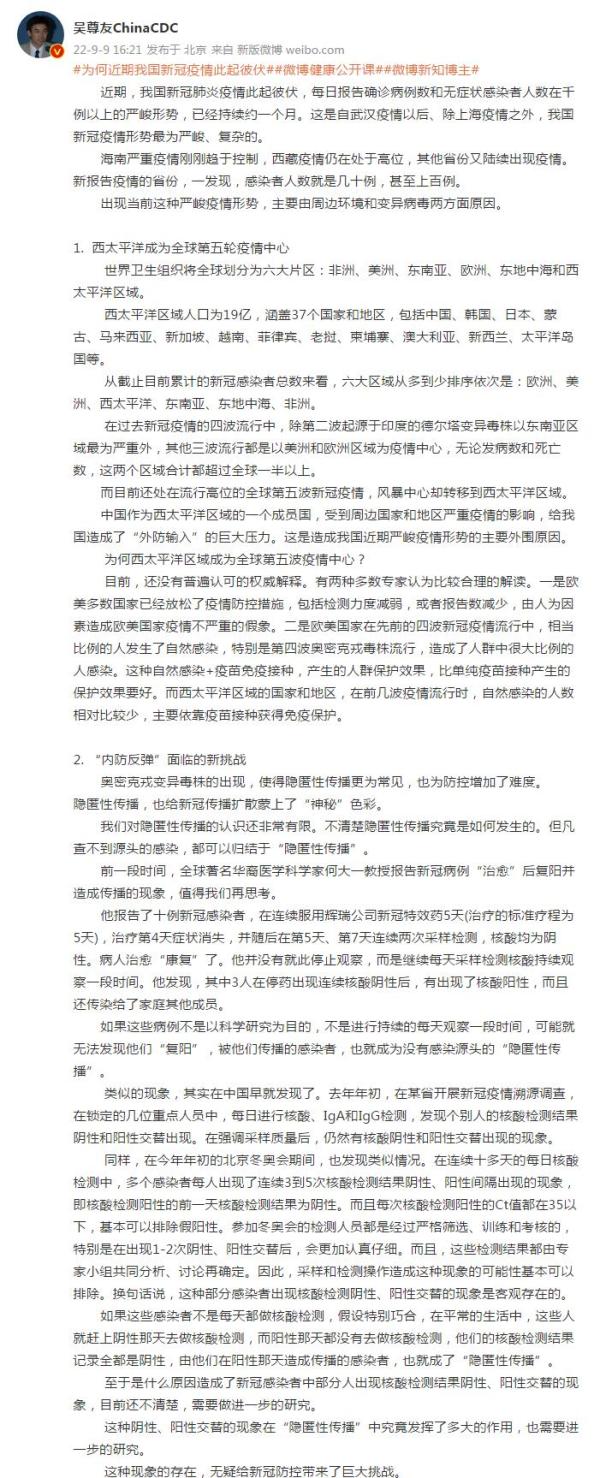 中国疾控中心流行病学首席专家吴尊友9月9日在微博发长文解释“为何近期我国新冠疫情此起彼伏”。全文如下: 近期,欧博娱乐我国新冠肺炎疫情此起彼伏,每日报告确诊病例数和无症状感染者人数在千例以上的严峻形势,已经持续约一个月。这是自武汉疫情以后、除上海疫情之外,我国新冠疫情形势最为严峻、复杂的。 海南严重疫情刚刚趋于控制,西藏疫情仍在处于高位,其他省份又陆续出现疫情。新报告疫情的省份,一发现,感染者人数就是几十例,甚至上百例。 出现当前这种严峻疫情形势,主要由周边环境和变异病毒两方面原因。 1. 西太平洋成为全球第五轮疫情中心 世界卫生组织将全球划分为六大片区:非洲、美洲、东南亚、欧洲、东地中海和西太平洋区域。 西太平洋区域人口为19亿,涵盖37个国家和地区,包括中国、韩国、日本、蒙古、马来西亚、新加坡、越南、菲律宾、老挝、柬埔寨、澳大利亚、新西兰、太平洋岛国等。 从截至目前累计的新冠感染者总数来看,六大区域从多到少排序依次是:欧洲、美洲、西太平洋、东南亚、东地中海、非洲。 在过去新冠疫情的四波流行中,除第二波起源于印度的德尔塔变异毒株以东南亚区域最为严重外,其他三波流行都是以美洲和欧洲区域为疫情中心,无论发病数和死亡数,这两个区域合计都超过全球一半以上。 而目前还处在流行高位的全球第五波新冠疫情,风暴中心却转移到西太平洋区域。 中国作为西太平洋区域的一个成员国,受到周边国家和地区严重疫情的影响,给我国造成了“外防输入”的巨大压力。这是造成我国近期严峻疫情形势的主要外围原因。 为何西太平洋区域成为全球第五波疫情中心? 目前,还没有普遍认可的权威解释。有两种多数专家认为比较合理的解读。一是欧美多数国家已经放松了疫情防控措施,包括检测力度减弱,或者报告数减少,由人为因素造成欧美国家疫情不严重的假象。二是欧美国家在先前的四波新冠疫情流行中,相当比例的人发生了自然感染,特别是第四波奥密克戎毒株流行,造成了人群中很大比例的人感染。这种自然感染+疫苗免疫接种,产生的人群保护效果,比单纯疫苗接种产生的保护效果要好。而西太平洋区域的国家和地区,在前几波疫情流行时,自然感染的人数相对比较少,主要依靠疫苗接种获得免疫保护。 2. “内防反弹”面临的新挑战 奥密克戎变异毒株的出现,使得隐匿性传播更为常见,也为防控增加了难度。 隐匿性传播,也给新冠传播扩散蒙上了“神秘”色彩。 我们对隐匿性传播的认识还非常有限。不清楚隐匿性传播究竟是如何发生的。但凡查不到源头的感染,都可以归结于“隐匿性传播”。 前一段时间,全球著名华裔医学科学家何大一教授报告新冠病例“治愈”后复阳并造成传播的现象,值得我们再思考。 他报告了十例新冠感染者,在连续服用辉瑞公司新冠特效药5天(治疗的标准疗程为5天),治疗第4天症状消失,并随后在第5天、第7天连续两次采样检测,核酸均为阴性。病人治愈“康复”了。他并没有就此停止观察,而是继续每天采样检测核酸持续观察一段时间。他发现,其中3人在停药出现连续核酸阴性后,有出现了核酸阳性,而且还传染给了家庭其他成员。 如果这些病例不是以科学研究为目的,不是进行持续的每天观察一段时间,可能就无法发现他们“复阳”,被他们传播的感染者,也就成为没有感染源头的“隐匿性传播”。 类似的现象,其实在中国早就发现了。去年年初,在某省开展新冠疫情溯源调查,在锁定的几位重点人员中,每日进行核酸、IgA和IgG检测,发现个别人的核酸检测结果阴性和阳性交替出现。在强调采样质量后,仍然有核酸阴性和阳性交替出现的现象。 同样,在今年年初的北京冬奥会期间,也发现类似情况。在连续十多天的每日核酸检测中,多个感染者每人出现了连续3到5次核酸检测结果阴性、阳性间隔出现的现象,即核酸检测阳性的前一天核酸检测结果为阴性。而且每次核酸检测阳性的Ct值都在35以下,基本可以排除假阳性。参加冬奥会的检测人员都是经过严格筛选、训练和考核的,特别是在出现1-2次阴性、阳性交替后,会更加认真仔细。而且,这些检测结果都由专家小组共同分析、讨论再确定。因此,采样和检测操作造成这种现象的可能性基本可以排除。换句话说,这种部分感染者出现核酸检测阴性、阳性交替的现象是客观存在的。 如果这些感染者不是每天都做核酸检测,假设特别巧合,在平常的生活中,这些人就赶上阴性那天去做核酸检测,而阳性那天都没有去做核酸检测,他们的核酸检测结果记录全都是阴性,由他们在阳性那天造成传播的感染者,也就成了“隐匿性传播”。 至于是什么原因造成了新冠感染者中部分人出现核酸检测结果阴性、阳性交替的现象,目前还不清楚,需要做进一步的研究。 这种阴性、阳性交替的现象在“隐匿性传播”中究竟发挥了多大的作用,也需要进一步的研究。 这种现象的存在,无疑给新冠防控带来了巨大挑战。
