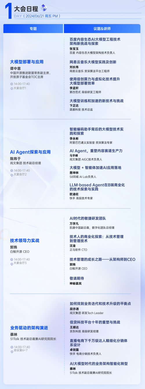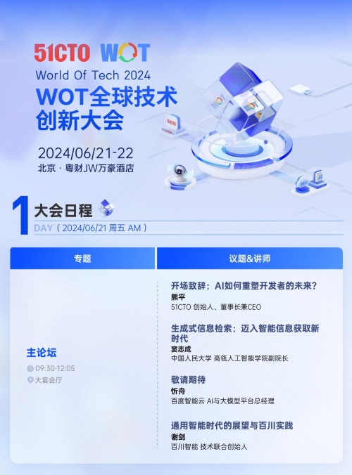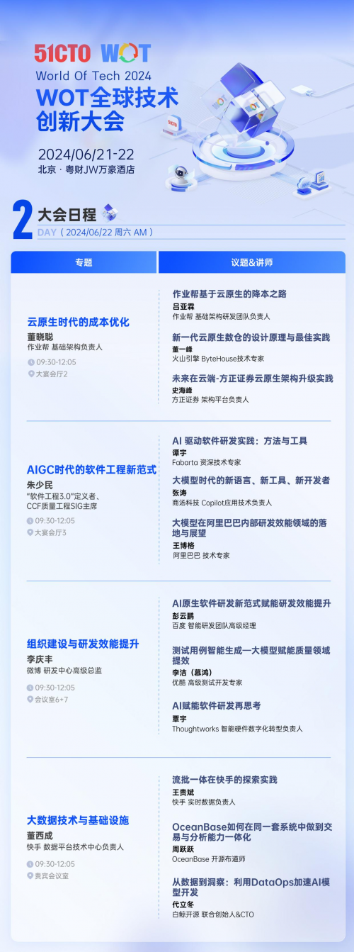 作为音乐平台开发者代表,网易云音乐如何基于自研 Modelzoo 实现大模型分布式管理、推理部署、推理优化?在Agent实践领域进展如何? 58同城基于开源通用大语言模型、使用58同城生活服务领域数据,如何打造垂类大语言模型——灵犀大模型ChatLing?灵犀垂类大语言模型、大语言模型平台和智能体平台的建设过程如何? 快手如何利用基于大语言模型的RAG和Agent技术,推动B端商业化的技术创新和应用实践? 作为阿里巴巴自研大模型,Aone Copilot如何通过代码补全、代码问答、代码评审workspace、Prompt市场等能力提升阿里内部研发效能? 竞技世界在直播亮点和舆情感知两个真实场景中,如何使用多模态AIGC在实际应用中获取价值? 在本届大会中,我们邀请来自百度、阿里、快手、去哪儿旅行、竞技世界、58同城、网易云音乐等多个已经开发、部署、应用大模型的企业现身说法,带来一线实践者的真实声音。 大模型技术创新有哪些突破点? 相对于实践应用的有待成熟,在大模型技术侧,不乏令人眼前一亮的技术创新。 百川智能技术联合创始人谢剑将在会上带来题为《通用智能时代的展望与百川实践》的主题分享,介绍百川智能的大模型最新动态。 潞晨科技技术总监卞正达将带来题为《大模型训练和加速的新技术与挑战》的分享,介绍潞晨科技全球首个开源复现ChatGPT的RLHF训练过程的完整解决方案。 大模型成为趋势的当下,对于算力的需求呈现指数级别上升,第四范式高级研发工程师李孟轩带来题为《使用信创算力与虚拟化技术提升大模型部署效率》的分享,介绍如何基于云原生的开源异构算力整合与虚拟化解决方案,降低国产异构算力的使用门槛。 在澜舟科技合伙人、算法和应用VP马永亮《企业级智能知识库搜索问答技术与应用》的分享中,将介绍大模型相关技术在企业级智能知识库搜索问答中的应用和挑战。 这些热门技术也值得关注 除大模型相关话题外,本届大会还设立了研发效能提升、架构演进、大数据、技术领导力、大前端等多个技术人持续关注的话题方向,邀请京东、51Talk、作业帮、方正证券、阅文集团等企业专家带来精彩分享。 白鲸开源CEO郭炜从自身经历,讲述从技术架构师到技术总监、从总监到CTO,最后成为CEO的成长之路。 51Talk技术副总裁兼AI研究院院长蔡林专注于AI驱动降本增效以及AI赋能创新业务,他将分享AI如何重塑业务流程,以及如何推动传统组织进行智能化转型。 券商系统架构复杂,方正证券一路走来,经历虚拟机、Docker和K8s容器化多个阶段,如何逐步迭代、实现云原生基础设施的构建?期待方正证券架构平台负责人史海峰的分享。 两年前就有人开始叫嚣“前端已死”。前端到底活得如何?在大前端场,我们邀请到了玉伯、狼叔、秦粤等前端从业者,在多年三缄其口后,让他们放开聊聊他们眼中的前端当前的挑战是什么,以及前端未来机会点在哪里? 出品人为内容保驾护航 无论是大模型话题,还是云计算、AI等话题,出品人老师的严格把关是内容质量的有力保障。 本届WOT技术大会的出品人是: 朱少民,“软件工程3.0”定义者、CCF质量工程SIG主席 陈炜于,阅文集团技术副总经理 郭炜,白鲸开源CEO 蔡林,51Talk技术副总裁 王建强,微软首席科学家 谭中意,中国开源推进联盟常务副主席、开放原子基金会TOC主席 李庆丰,微博研发中心高级总监 巴川,竞技世界首席数据科学家 曾骁,优酷C端算法负责人 董晓聪,作业帮基础架构负责人 蒲松洋(秦粤),阿里巴巴高级前端技术专家 董西成,快手数据平台技术中心负责人 大会出品人具备多年一线实践经验,对于各自所操刀的主题,他们还有宏观的视角和判断。这些出品人的深度输出,为本届WOT内容品质保驾护航。 (责任编辑:) |