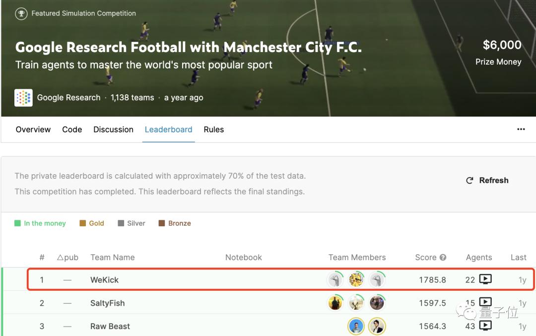 言归正传,以上其实是清华大学在足球游戏中打造的一个强大的多智能体强化学习AI——TiKick。 在多项国际赛事中夺得冠军则是指,TiKick在单智能体控制和多智能体控制上均取得了SOTA性能,并且还是首次实现同时操控十个球员完成整个足球游戏。 这支强大的AI团队是如何训练出来的呢? 从单智能体策略中进化出的多智能体足球AI 在此之前,先简单了解一下训练所用的强化学习环境,也就是这个足球游戏:Google Research Football(GRF)。 它由谷歌于2019年发布,提供基于物理的3D足球模拟,支持所有主要的比赛规则,由智能体操控其中的一名或多名足球运动员与另一方内置AI对战。 在由三千步组成的上下半场比赛中,智能体需要不断决策出移动、传球、射门、盘球、铲球、冲刺等19个动作完成进球。 在这样的足球游戏环境中进行强化学习难度有二: 一是因为多智能体环境,也就是一共10名球员(不含守门员)可供操作,算法需要在如此巨大的动作空间中搜索出合适的动作组合; 二是大家都知道足球比赛中一场进球数极少,算法因此很难频繁获得来自环境的奖励,训练难度也就大幅增大。 而清华大学此次的目标是控制多名球员完成比赛。 他们先从Kaggle在2020年举办的GRF世界锦标赛中,观摩了最终夺得冠军的WeKick团队数万场的自我对弈数据,使用离线强化学习方法从中学习。 这场锦标赛只需控制场中的一名球员进行对战。