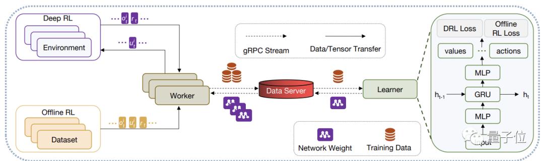 如何从单智能体数据集学习出多智能体策略呢? 直接学习WeKick中的单智能体操作并复制到每个球员身上显然不可取,因为这样大家都只会自顾自地去抢球往球门冲,根本就不会有团队配合。 又没有后场非活跃球员动作的数据,那怎么办? 他们在动作集内添加了第二十个动作:build-in,并赋予所有非活跃球员此标签(比赛中若选用build-in作为球员的动作,球员会根据内置规则采取行动)。 接着采用多智能体行为克隆(MABC)算法训练模型。 对于离线强化学习来说,最核心的思想是找出数据中质量较高的动作,并加强对这些动作的学习。 所以需在计算目标函数时赋予每个标签不同的权重,防止球员倾向于只采用某个动作作为行动。 这里的权重分配有两点考虑: 一是从数据集中挑选出进球数较多的比赛、只利用这些高质量的数据来训练,由于奖励较为密集,模型能够加速收敛并提高性能。 二是训练出Critic网络给所有动作打分,并利用其结果计算出优势函数,然后给予优势函数值大的动作较高的权重,反之给予较低的权重。 此处为了避免梯度爆炸与消失,对优势函数做出了适当的裁剪。 最终的分布式训练架构由一个Learner与多个Worker构成。 其中Learner负责学习并更新策略,而Worker负责搜集数据,它们通过gRPC进行数据、网络参数的交换与共享。