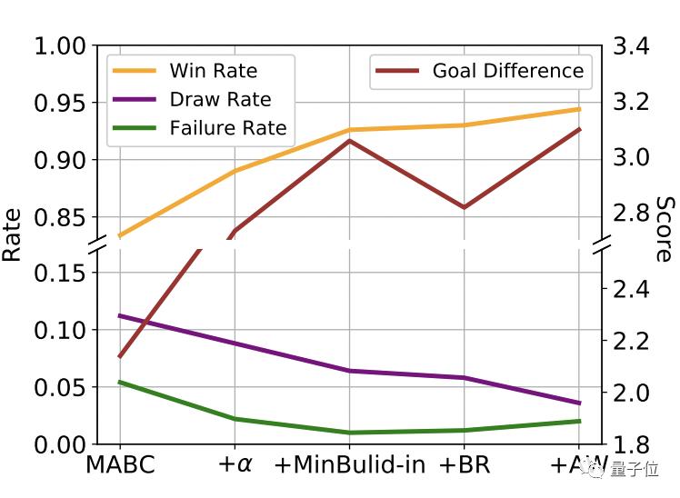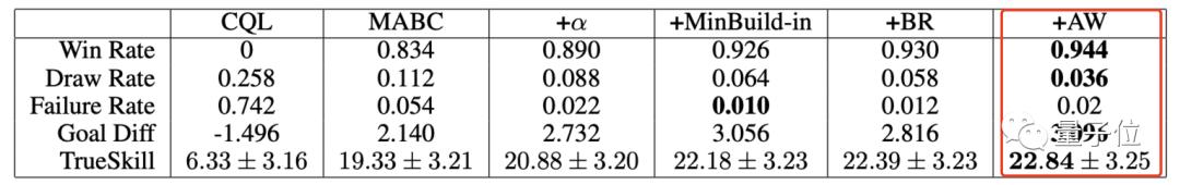 Worker可以利用多进程的方式同时与多个游戏环境进行交互,或是通过I/O同步读取离线数据。 这种并行化的执行方式,也就大幅提升了数据搜集的速度,从而提升训练速度 (5小时就能达到别的分布式训练算法两天才能达到的同等性能)。 另外,通过模块化设计,该框架还能在不修改任何代码的情况下,一键切换单节点调试模式和多节点分布式训练模式,大大降低算法实现和训练的难度。 94.4%的获胜率和场均3分的净胜分 在多智能体(GRF)游戏上的不同算法比较结果中,TiKick的最终算法(+AW)以最高的获胜率(94.4%)和最大的目标差异达到了最佳性能。 TrueSkill(机器学习中竞技类游戏的排名系统)得分也是第一。