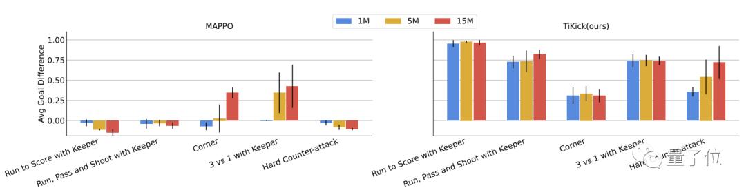 与其中的基线MAPPO相比还发现,在五个场景当中的四个场景都只需100万步就能达到最高分数。