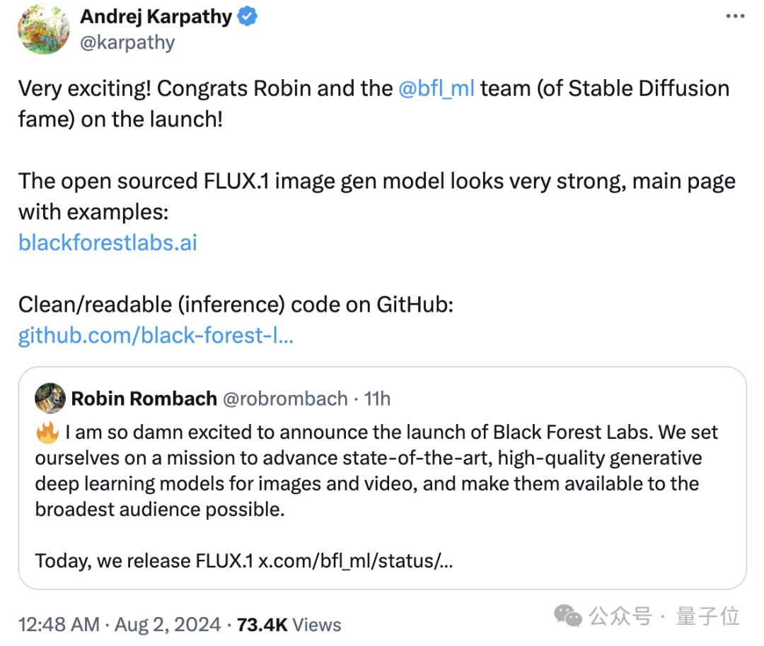 要说这家公司的特色,就是主打一个不遮遮掩掩。 今天官宣成立,今天发布系列模型,还宣布了融资进度—— 已经完成3200万美元融资,由a16z领投, Oculus VR联创Brendan Iribe、YC前合伙人Garry Tan、NVIDIA Research领导计算机图形研究小组的Timo Aila、苹果杰出科学家(英特尔智能系统前首席科学家)Vladlen Koltun等人投资。 可以说,黑森林既得到了资本市场的押注,也得到了业界大佬们的青睐。 AI大牛卡帕西也在线发来贺电,还顺道称赞了一下黑森林的新模型: 歪瑞古德!开源的FLUX.1 image gen模型看起来非常强大。
