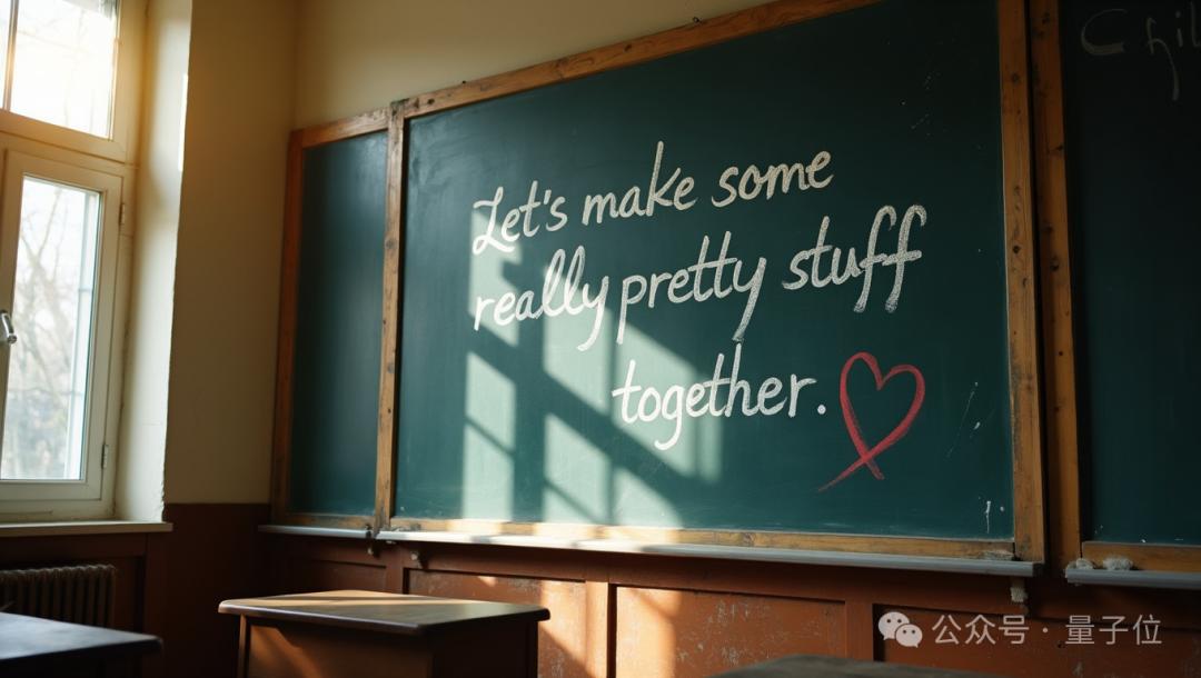 而且注意了,开源协议是宽松的Apache2.0。 黑森林图像生成模型首秀 卡帕西都觉得exciting了,让咱来视觉感受下黑森林的模型效果。 这里,量子位挑选了五种类型的生成效果展示,图片均由官方提供,未标明具体使用了旗下哪款模型。 第一关,文字生成。 提示词:旧教室黑板的照片。黑板上用粉笔写着“let’s make some really pretty stuff together”,词后有一个红色的粉笔心。阳光从窗户照进来。