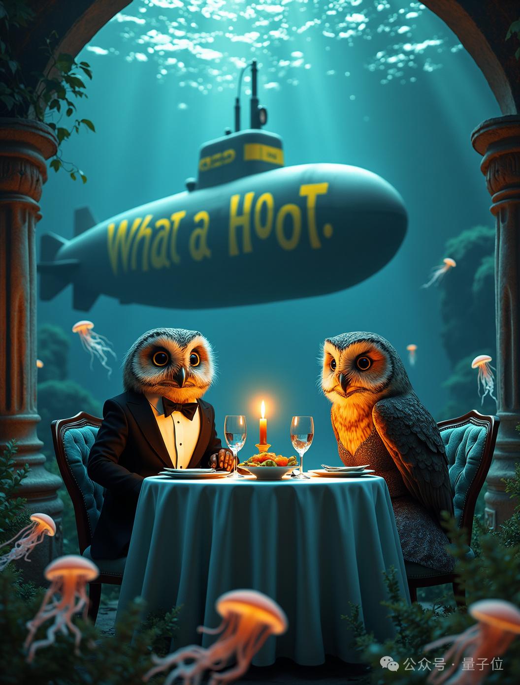 第二关,非真实场景+文字生成。 提示词:水下场景中,两只猫头鹰坐在一张精美的餐桌旁,餐桌中央点燃了蜡烛,两只猫头鹰正在一起享用一顿美味的晚餐。左边的猫头鹰穿着燕尾服,右边的猫头鹰穿着漂亮的裙子。背景中有一艘潜艇驶过,其侧面画有“What a Hoot”字样。桌子下面的图像底部有小水母在游动,电影般美丽的数字艺术品。