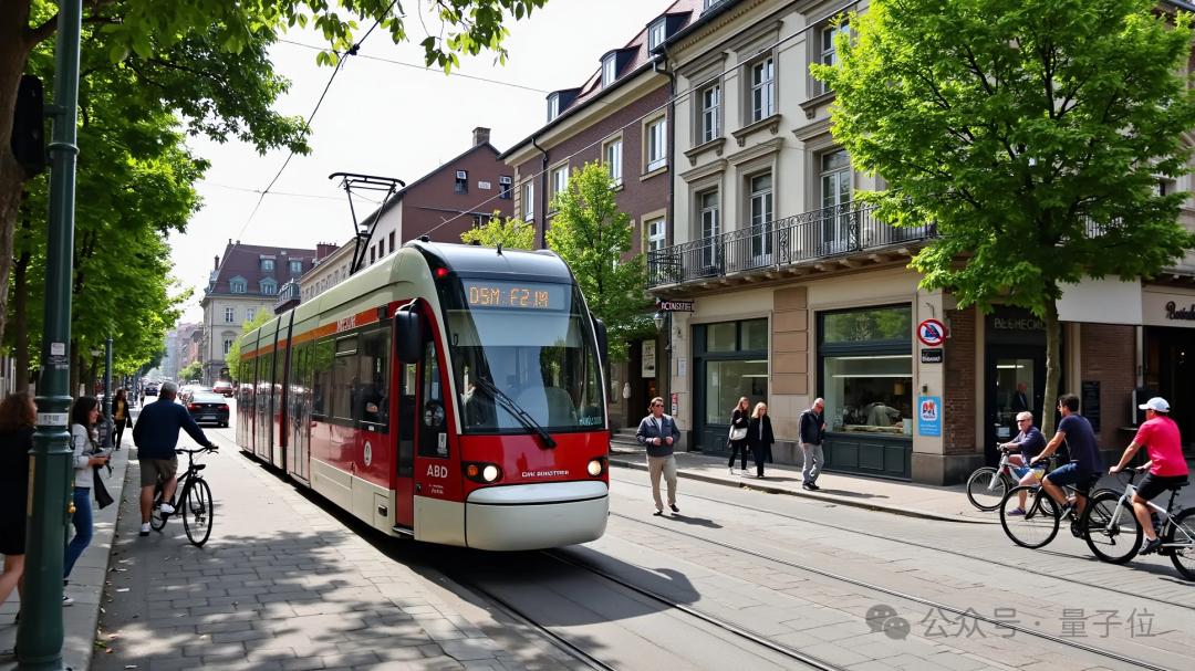 第三关,现实世界真实场景。 提示词:弗莱堡一条美丽街道的照片,一辆有轨电车经过,人们有的散步有的骑自行车。