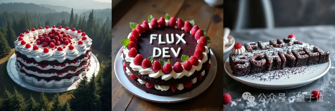 FLUX.1 [pro]:系列最强音。 FLUX.1系列的精华,提供最优性能的图像生成,具有一流的指令遵循、视觉质量、图像细节和输出多样性。 黑森林团队正缓步提升API中FLUX.1 [pro]的推理计算能力。 此版本可以通过Replicate和fal.ai访问;提供专用和定制的企业解决方案。 FLUX.1 [dev]:系列中杯。 一个允许非商业途径使用的模型,开放权重、经过蒸馏。 [dev] 直接从[pro] 中蒸馏而来,具有相似的质量和迅速的遵守能力,同时比相同尺寸的标准模型更高效。 可在抱抱脸上试玩,或直接在Replicate或fal.ai上试用。 FLUX.1 [schnell]:速度小旋风。 系列最快模型,为本地开发和个人开发者量身制作。 FLUX.1 [schnell] 在Apache2.0许可证下公开可用,模型权重可以前往抱抱脸查询,推理代码可以在GitHub上找到。 已经获得了ComfyUI的支持,可以直接使用;也可以通过Replicate或fal.ai使用。 来个直观感受! 这里放三张照片,是以上大杯、中杯、小杯在不同提示词下,围绕“蛋糕”这个主题的生成效果。