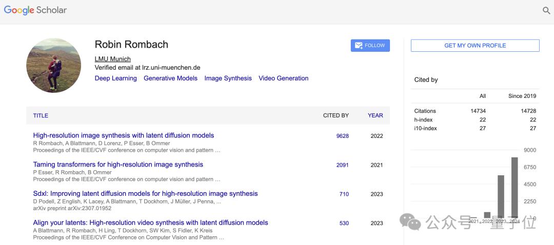 往前回顾,Robin在海德堡大学拿下物理学的本科和硕士学位。 2020年,他在海德堡计算机视觉小组在Björn Ommer的指导下开始攻读计算机科学博士学位,并于2021年随研究小组移至慕尼黑大学。 研究重点关于生成深度学习模型,特别是文本到图像系统。 谷歌学术被引数接近1.5万。