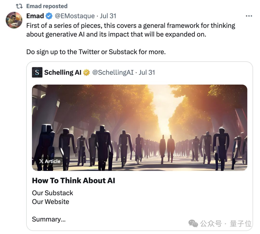 那Stability AI在3月跑路的CEO,Emad Mostaque,他在干嘛呢? 六月份,他官宣了自己的去向,新公司Schelling AI,“将构建和支持由AI资金支持的开源代码、模型和数据集”。 重点精力放在创新研究和精心构建具有文化意识、科学、教育和创意的AI。 三天前,Schelling AI发布了系列文章第一篇,《How To Think About AI》。 文章有点长,感兴趣的朋友们可以搜索自行查看,这里就提一下核心思想—— AI发展很快,提倡开源开放,加速创新协作。