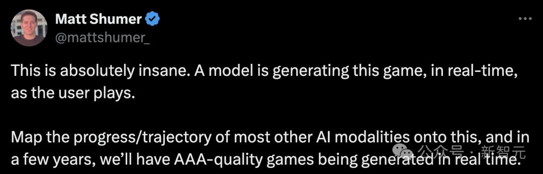 大佬们「疯了」 AI初创HyperWrite的CEO Matt Schumer表示,这简直太疯狂了!用户玩游戏时,一个模型正在实时生成游戏。 如果将大多数AI模型的进展/轨迹映射到这上面,那么在几年内,我们将会得到3A级生成游戏。