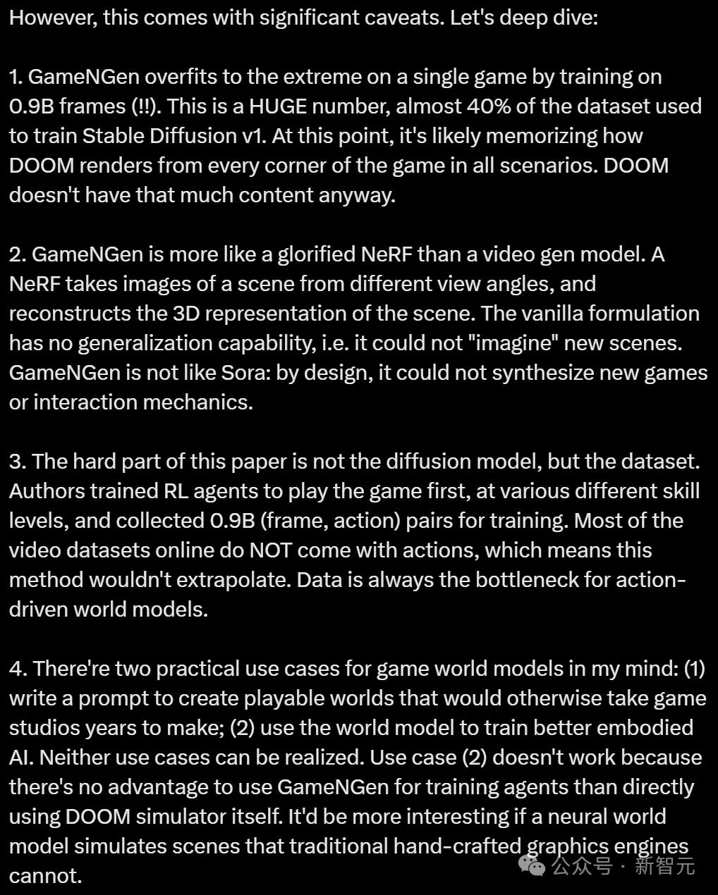 连Sora跟它比起来,都黯然失色。我们只能设定初始条件(一个文本或初始帧),然后只能被动观看模拟过程。 因为Sora无法进行交互,因此还不算是一个「数据驱动的物理引擎」。 而GameNGen是一个真正的神经世界模型。它将过去的帧(状态)和用户的一个动作(键盘/鼠标)作为输入,并输出下一帧。这种质量,是他见过的最令人印象深刻的DOOM。 随后,他深度探讨了一些GameNGen中存在的限制。 比如在单个游戏上过拟合到了极致;无法想象新的场景,无法合成新的游戏或交互机制;数据集的瓶颈,导致了方法无法推广;无法实现用提示词创造可玩世界,或用世界模型训练更好的具身AI,等等。