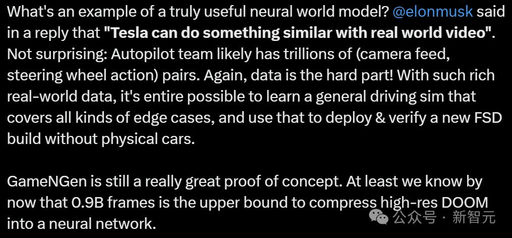 一个真正有用的神经世界模型,应该是什么样子? 马斯克的回答是:「特斯拉可以用真实世界的视频做类似的事情」。 的确,数据是难点。 Autopilot团队可能拥有数万亿的数据对(摄像头视频,方向盘动作)。 有了如此丰富的真实世界数据,完全有可能训练一个涵盖各种极端情况的通用驾驶模拟器,并使用它来部署和验证新的完全自动驾驶(FSD)版本,而不需要实体车辆。