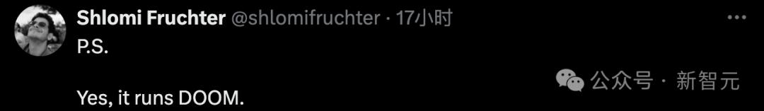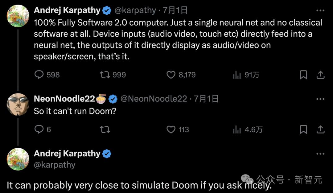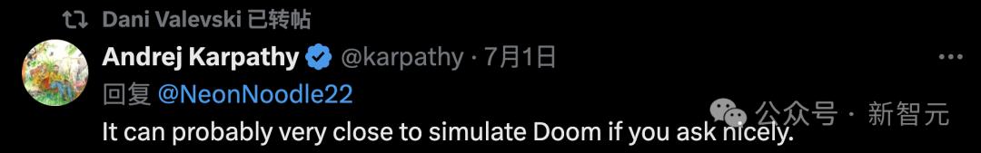 GameNGen的诞生,是源于一个好奇心: 「我们能否在当前的处理器上,运行一个隐式神经网络,来进行实时互动游戏」。 对于Fruchter以及团队成员来说,最终答案是一个令人兴奋的发现。 AI大牛Karpathy曾说过,100%纯软件2.0计算机,只有一个神经网络,完全没有传统软件。 设备输入(音频、视频、触摸等)直接到神经网络中,其输出直接作为音频/视频在扬声器/屏幕上显示,就是这样。 有网友便问道,那就是它不能运行DOOM了? 对此,Karpathy表示,如果能够很好提出请求,它可能可以非常接近地模拟DOOM。