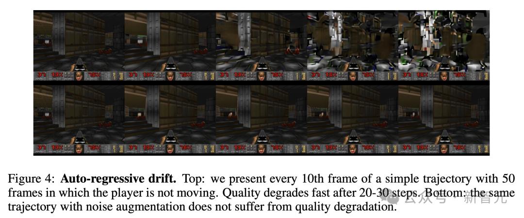 GameNGen方法概述(省略v-prediction细节) 噪声增强减轻自回归漂移 从原Stable Diffusion的教师强制训练转换为游戏引擎中的自回归采样,会不可避免地导致错误累积和样本质量快速下降。 为了避免这个问题,训练生成模型时会在编码过的上下文帧中添加不同数量的高斯噪声,同时将噪声水平作为模型的输入,从而让降噪网络可以纠正先前帧中采样的信息。 这些操作对于随着时间推移时保证帧质量至关重要。在推理过程中,也可以控制添加的噪声水平以最大限度地提高生成质量。