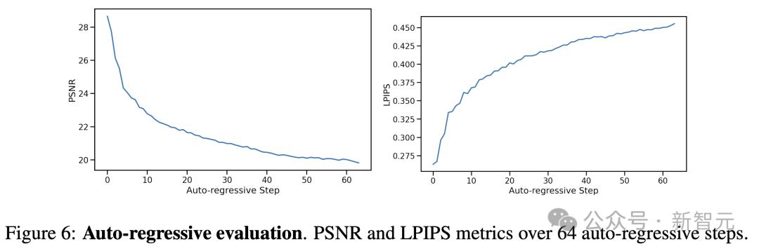 视频质量 针对视频质量,研究人员使用了自回归设置,即模型基于自己的过去预测来生成后续帧。 不过,预测和真实轨迹在几步后会发生偏离,主要是由于帧间移动速度的微小差异累积。 如下图6所示,随着时间推移,每帧的PSNR值下降,LPIPS值上升。