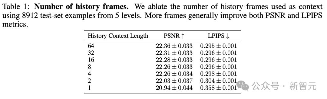 评估者的任务,便是识别其中,哪一个是真实游戏。 结果发现,针对1.6秒生成游戏的片段,在58%情况下,他们认为GameNGen生成游戏是真实的。 而对于3.2秒片段,这一比率更高,达到了60%。 消融实验 接下来,研究者评估了架构中,不同组件的重要性,从评估数据集中采样轨迹,并计算地面真值与预测帧之间的LPIPS和PSNR指标。 上下文 通过训练N∈{1, 2, 4, 8, 16, 32, 64}模型,测试上下文中过去观察数量N的影响。(标准模型使用了N=64)。 这影响了历史帧和动作的数量。 保持解码器冻结情况下,训练模型200,000步,并在5个关卡的测试集轨迹上进行评估。 结果如下表1所示,如预期一样,研究者观察到GameNGen生成质量,随着上下文增加,而提升。 更有趣的是,在1帧和2帧之间,这一改进非常大,但往后开始很快接近了阈值线,改进质量逐渐放缓。 即便用上了最大上下文(64帧),GameNGen模型也仅能访问,略超过3秒的历史信息。 另一个发现是,大部分游戏状态可能会持续更长时间。