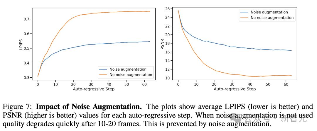 表1结果很好地说明了,未来可能需要改变模型架构,来支持更长的上下文。同时,探索更好的方法,采用过去帧作为条件。 噪声增强 为了消除噪声增强的影响,研究人员还训练了一个没有添加噪声的模型。 通过对比评估,经过噪声增强的标准模型和没有添加噪声的模型(在200k训练步骤后),以自回归方式计算预测帧与真实帧之间的PSNR和LPIPS指标。 如下图7所示,呈现了每个自回归步骤的平均指标值,总共达64帧。 这些评估是在随机保留的512条轨迹上进行的。