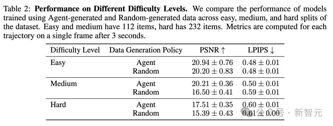 总得来说,研究观察到,在随机轨迹上训练模型效果出乎意料地好,但受限于随机策略的探索能力。 而在比较单帧生成时,智能体仅略胜一筹,达到25.06 PNSR,而随机策略为24.42。 而在比较3秒情况下,差异增加到19.02 Vs 16.84。 在手动操作模型时,他们还观察到,某些区域对两者都非常容易,某些区域对两者都非常困难,而在某些区域智能体表现更好。 因此,作者根据其在游戏中与起始位置的距离,将456个示例手动分为三个级别:简单、中等和困难。 如下表2所示,结果观察到,在简单和困难集合中,智能体仅略优于随机,而在中等集合中,智能体的优势如预期般更大。