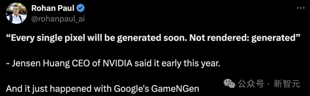 0代码生成游戏,老黄预言成真 今天,视频游戏,是由人类编程的。 GameNGen的诞生,开启了实时互动视频游戏的全新范式。 在这一范式中,游戏是神经模型的「权重」,而非代码行。 如今看来,老黄的预言近在眼前。
