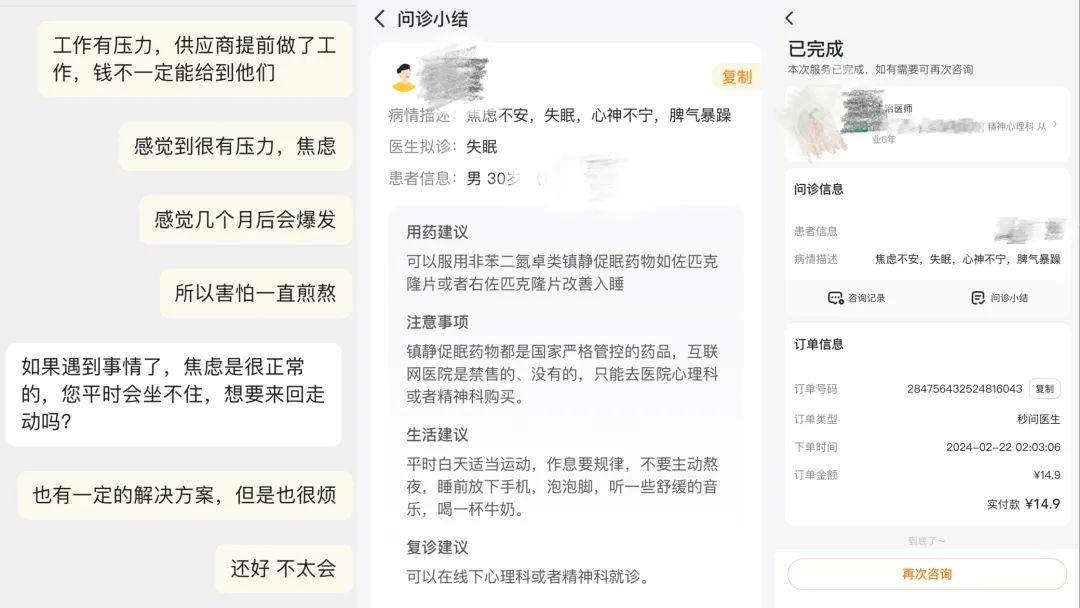 得到的是冰冷的回复。 我觉得我需要一个真人。我想到了线上问诊,挂了某外卖平台上的精神心理科。说来好笑,xx买药的广告真是深入人心。 我向医生描述我的工作情况,这已经是我第三次重复了,但好像医生并不关心我为什么焦虑。她的问题是,“你可以睡几个小时?几点能入睡?吃褪黑素有没有用?”。最后她以“失眠”作为对我的诊断,建议我睡前泡脚、听音乐、喝牛奶。我感觉我们的对话只是为了她能开出处方。