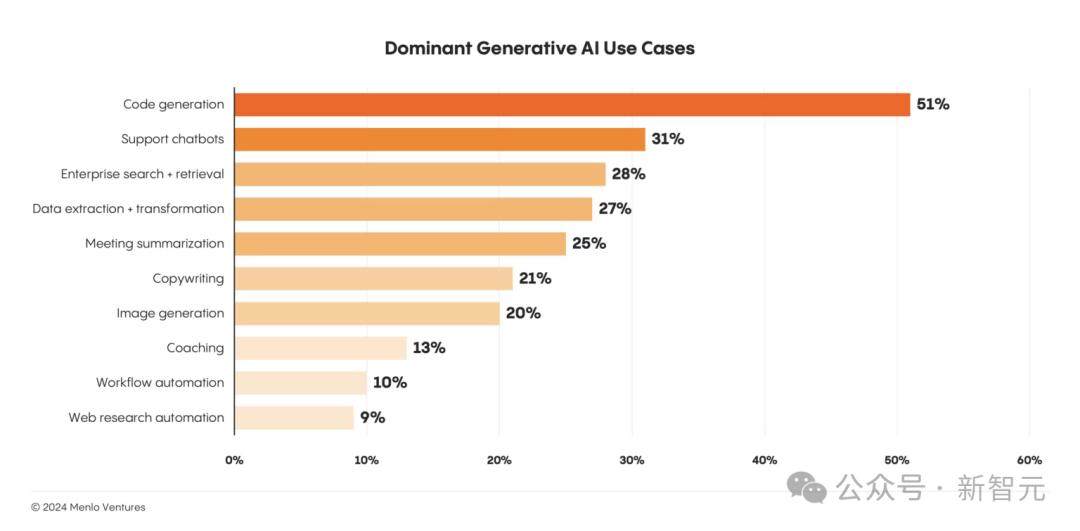 我们仍处于大规模转型的早期阶段,企业领导者才刚刚开始认识到生成型人工智能将对其组织产生的深远影响。 应用层正在升温 2024年,大部分AI大事件都发生在「应用程序」层,利用LLMs跨领域的能力来提升效率。 投资者在全年面向应用层投入46亿美元,比去年的6亿美元增长了近8倍。 在公司侧,企业家的目标也更高了,公司不仅增加了支出,想法也变多了,平均每个企业都确定了10个潜在用例,其中近四分之一(24%)被优先考虑在近期实施;只有少数用例在生产中,而其中三分之一仍处于原型设计和评估阶段(33%)。 最有价值的用例 虽然AI应用仍然是一片实验场,但部分应用场景下,已经证实了其能够提高生产力和运营效率。