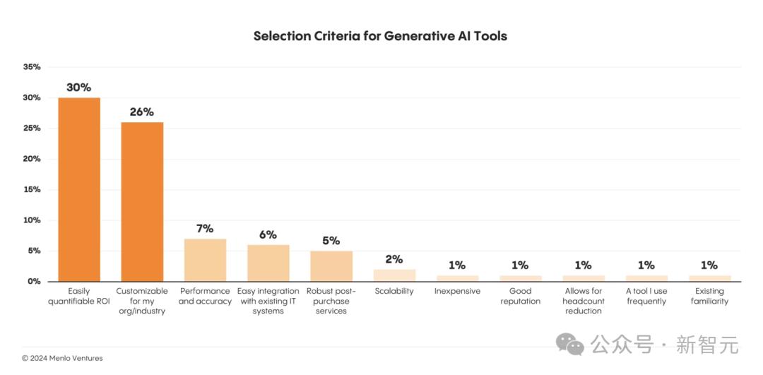 Code Copilots 以51%的采用率遥遥领先,也使得开发人员成为了AI领域最早的资深用户。 GitHub Copilot的收入迅速攀升至3亿美元,Codeium和Cursor等新兴工具也在快速增长。 除了通用编码助手之外,企业还会购买特定任务的编程助手应用,例如Harness的AI DevOps Engineer、可用于管道生成和测试自动化的QA助理,以及类似All Hands这样能够执行更多端到端操作的AI智能体软件开发。 Support chatbots 企业采用率为31%,可以为内部员工和外部客户提供可靠、24/7、基于知识的支持,产品包括Aisera、Decagon和Sierra,能够直接与终端客户互动;Observe AI在通话期间为联络中心座席提供实时指导。 企业搜索/检索+数据提取/转换 采用率分别为28%和27%,企业需要利用上数据孤岛中的宝贵知识。 Glean和Sana等解决方案可连接到电子邮件、即时通讯工具和文档存储,从而实现跨不同系统的统一语义搜索,并提供基于AI的知识管理能力。 会议总结 在使用案例中排名第五,采用率为24%,通过自动化生成笔记和要点来节省时间并提高生产力。 产品包括Fireflies.ai、Otter.ai和Sana等,能够捕获并总结在线会议;Fathom从视频中提取关键点;Eleos Health将这一创新应用于医疗保健,自动化记录时间并直接与EHR集成,以便医疗保健提供者可以专注于患者护理。 智能体 当前的实践模式表明,与完全自动化相比,用户更倾向于辅助增强人工流程,但行业目前正在向更加自主、完全自动化的解决方案进行过渡。 现有工具包括金融后台工作流程Forge、Sema4,以及上市工具Clay,展现了「完全自主的生成式人工智能系统」能够改变传统上以人类为主导的部门,有望走向未来「服务即软件」(Services-as-Software)的时代。 自研还是买? 两种方案的公司比例几乎持平:47%的公司选择内部开发,53%选择供应商。 与2023年相比,变化相当明显,当时80%的企业仍然依赖第三方生成式人工智能软件,表明现在的企业越来越有信心和能力建立自己的内部AI工具。 AI是一场长期游戏 只有1%的买家将低价作为主要关注点,现在企业更关注那些能够提供可衡量价值(30%)并具有独特研发背景(26%)的AI工具。