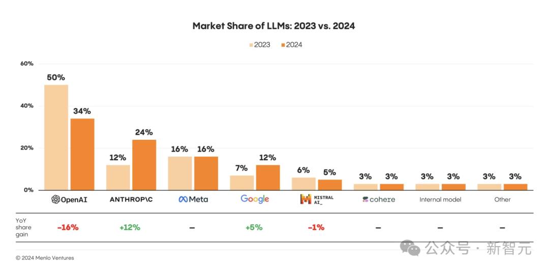 基础模型仍然占主导地位,LLM层需要65亿美元的企业投资。 通过反复试验,企业越来越了解数据脚手架(data scaffold)和复合架构方面的重要性,更重视在生产中可靠地执行,而不仅仅是一次性演示。 LLM趋势:多模型策略盛行 企业不再依赖单一提供商,而是采用务实的多模型方法。 研究表明,组织通常在其人工智能堆栈中部署三个或更多基础模型,然后根据用例或结果路由到不同模型。 目前81%的市场方案为闭源模型,而开源替代方案(以Meta的Llama 3为首)稳定在19%,比2023年仅下降了1个百分点。 在闭源模型中, OpenAI的先发优势有所削弱,企业市场份额从50%下降至34%,一些企业在选择模型时从GPT-4转向Claude 3.5 Sonnet,主要受益者Anthropic的企业占有率从12%翻了一番至24% 当选择新模型时,企业的主要考虑因素包括安全 (46%)、价格 (44%)、性能 (42%) 和扩展功能 (41%) 。