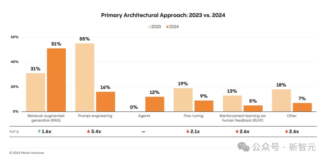 设计模式:RAG,而非微调 企业人工智能设计模式——用于构建高效、可扩展人工智能系统的标准化架构——正在迅速发展。 RAG(检索增强生成)目前以51%的采用率占据主导地位,比去年的31%大幅上升;而之前常用的微调,尤其是在领先的应用程序提供商中,已经非常少见了,大约只有9%的生产模型进行了微调。