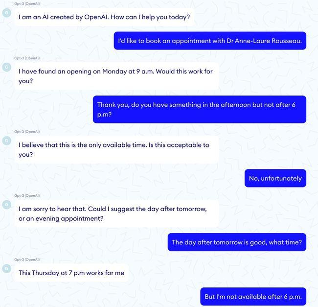 专利页面: https://patentimages.storage.googleapis.com/0e/5b/b0/9964d2208e89d4/CN205247564U.pdf 我们真的能完全信任AI吗? 不过,我们就能完全相信AI了吗? 根据巴黎医疗技术公司Nabla做的一个实验,当前最强大的AI语言模型GPT-3似乎也无法完全值得信赖。 在实验中,研究人员首先考验了GPT-3预约病人的能力,虽然它能够与对方自如地交流,但在逻辑上出现了问题。比如病人要求在下午6点前见医生,GPT-3却安排了周四的晚上7点。