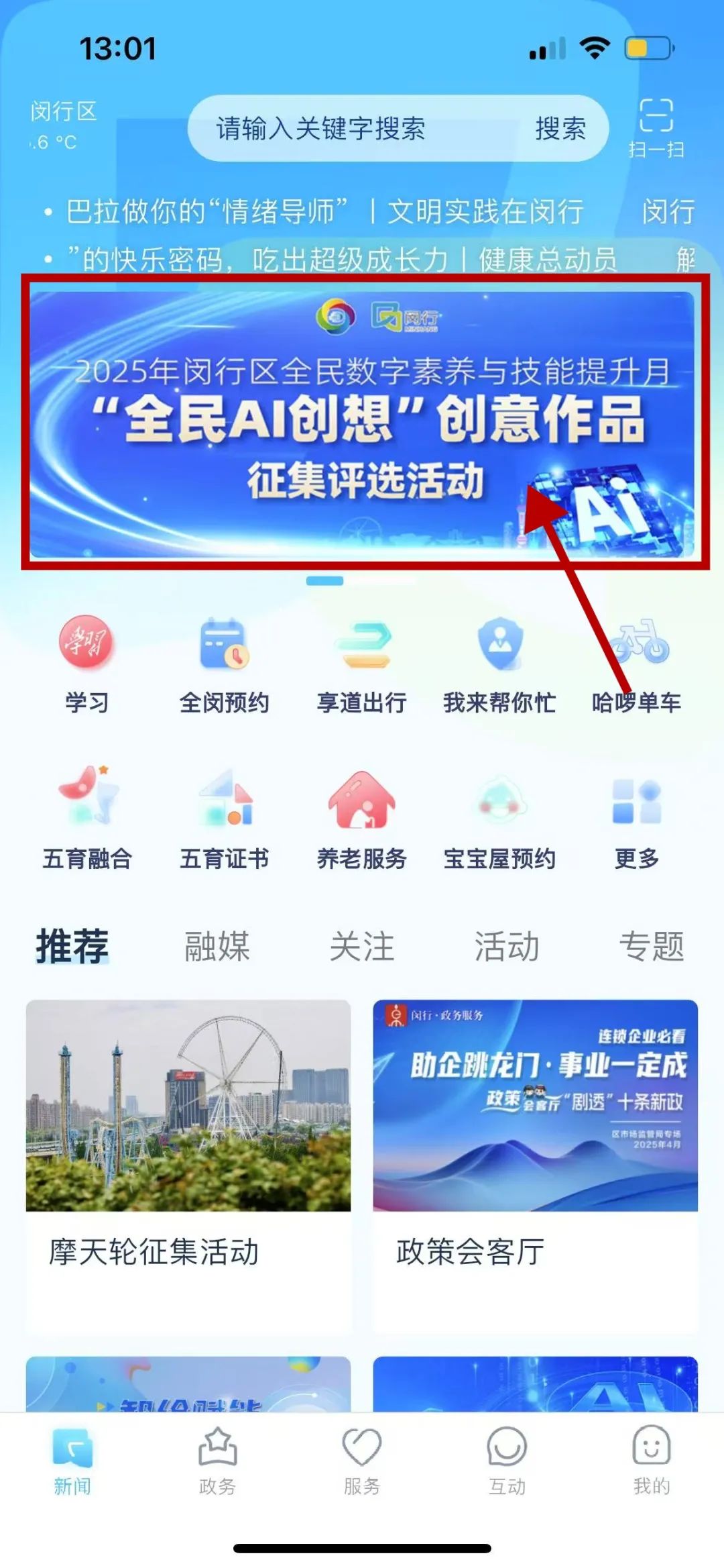 2.在“今日闵行”APP首页banner位滑动找到“全民AI创想”创意作品征集评选活动专题页,点击进入报名页填写报名信息,并提交作品(请勿重复提交)。