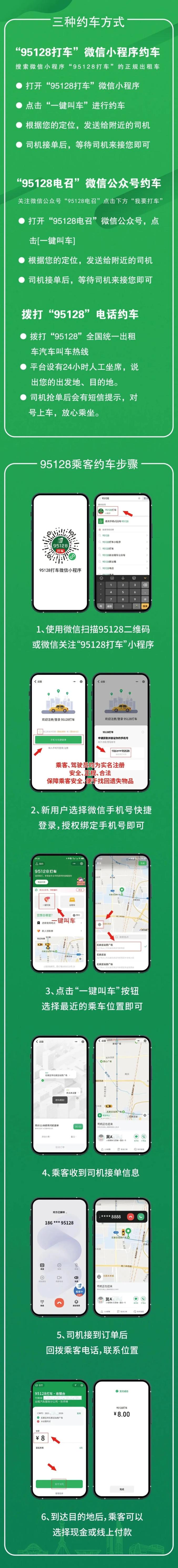 细心的市民近期发现石家庄街头的大部分出租汽车都贴上了95128约车电话的字样,这是全国统一的出租出约车服务电话,打个电话或者在微信小程序上输入去的地方,就能很方便的约到出租车。 8月20日,石家庄市95128巡游出租汽车约车电话服务平台经过试运行后正式开通运行。 95128出租汽车电召平台是根据交通运输部部署建设的服务民生保障人民群众出行便利的公益性平台。交通运输部将95128电召服务列为交通强国建设试点内容。 石家庄市95128巡游出租汽车电话约车平台从2023年11月开通试运行,并已延伸至正定、平山、灵寿等县(市、区),受到广大市民和出租汽车驾驶员的充分肯定和积极响应,取得良好的社会效益。经过紧张筹备和半年多的试运行,石家庄市95128巡游出租汽车约车电话服务平台今日起正式开通运营。 石家庄市内五区(长安区、桥西区、新华区、裕华区、高新区)巡游出租汽车和巡游出租车驾驶员全部纳入到95128电召平台,并逐步扩大服务区域至各县(市、区)。目前,市区95%以上的出租车和驾驶员均在平台注册,为老年人和市民提供网络预约出租车服务。 可通过三种方式约车 使用①微信小程序“95128打车” ②“95128电召”公众号 ③直接拨打95128电话。 为了解决老年人操作智能手机不熟练的问题,平台在95128电话座席人工受理预约以外,还在小程序上设计了“一键叫车”功能,只用一个键就能完成约车,简便易操作。 平台实名电话功能,驾驶员接单后第一时间联系乘客,确定具体位置。并且乘客约车时,如有物品遗失,也可第一时间联系到驾驶员。