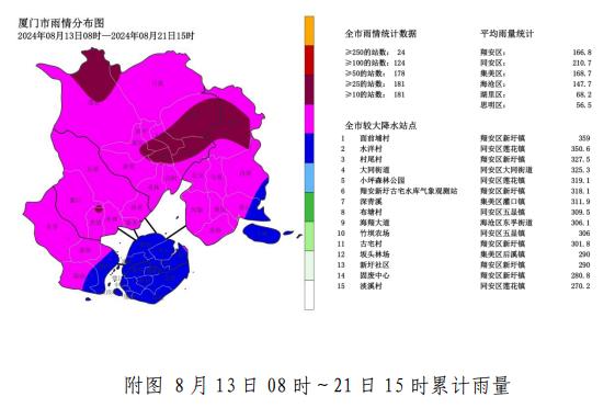 降水明显减弱 暴雨预警解除 厦门市气象台 今天15时30分发布 ↓↓↓ 根据最新资料分析 我市降水已明显减弱 解除全市暴雨预警 统计厦门市8月13日8时 至21日15时雨量 (单位:毫米) 全市平均143.7,同安区平均210.7、集美区平均168.7、翔安区平均 166.8、海沧区平均147.7、湖里区平均68.2、思明区平均56.5。全市共有11个镇街,24个站点大于250 毫米。最大雨量出现在翔安区新圩镇359毫米,最大小时雨强出现在翔安区新圩镇114.8毫米。