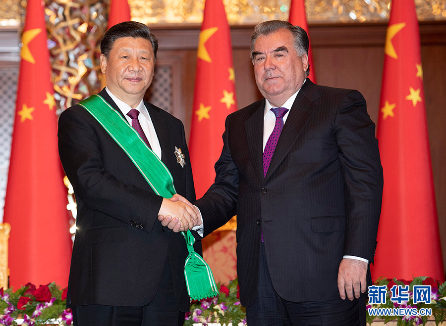 6月15日,国家主席习近平在杜尚别出席仪式,接受塔吉克斯坦总统拉赫蒙授予“王冠勋章”。 新华社记者 沙达提 摄 在意大利奎里纳莱宫总统书房,同马塔雷拉总统促膝而谈;在摩纳哥王宫家族厅,同阿尔贝二世亲王畅叙家国情怀;在法国尼斯海燕别墅,同马克龙总统共同追忆中法友好交往的历史;在俄罗斯圣彼得堡冬宫,同普京总统一对一交谈至深夜;在吉尔吉斯斯坦总统官邸,同热恩别科夫总统亲切茶叙;在塔吉克斯坦总统府,接受拉赫蒙总统授予塔国家最高勋章“王冠勋章”;在平壤锦绣山迎宾馆,同金正恩委员长在庭院散步交谈……