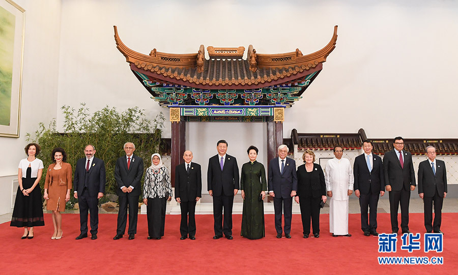 5月14日,国家主席习近平和夫人彭丽媛在北京人民大会堂举行宴会,欢迎出席亚洲文明对话大会的外方领导人夫妇及嘉宾。这是习近平和彭丽媛同外方领导人夫妇及嘉宾合影。 新华社记者 饶爱民 摄