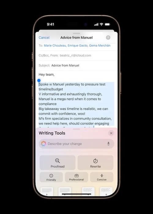 (来源:苹果官网) 对于取消Home键、将静音拨片改为触摸按压式按键的苹果而言,此时增加一个“物理按键”,多少有些“开倒车”的感觉。甚至于,在开启摄像头上,两颗按键还有一定程度的“功能重合”。 如果仅是为了拍照录像方便,苹果大可不必如此大费周章。唤醒AI,或许才是这颗“物理按键”的终极使命——“今年晚些时候,相机控制将解锁视觉智能,帮助用户以前所未有的速度了解物体和地点。” 具体而言,用户可以单击并按住相机控制,调出他们经过的餐厅,以获取营业时间和评级等信息,进而下单消费;将传单中的活动添加到日历中;按品种快速识别狗等等。 此外,相机控制还将成为进入第三方工具的“入口”,例如用谷歌查找想要购买的商品,用ChatGPT答疑解惑…… 苹果或许正是想通过一个略显多余的按键,来占领AI的入口,逐步培养用户习惯,最终强化自身的AI能力。 “苹果AI”姗姗来迟,多项功能并不“新鲜” 相较于OpenAI的高歌猛进和国内的“百模大战”,在大模型热潮下,苹果依旧“不紧不慢”。 终于在今年当地时间6月10日的WWDC上,Apple智能方才“姗姗来迟”。虽然苹果用了一个与众不同的词,但这并不妨碍外界称呼其为“苹果AI”。毕竟,Apple Intelligence的缩写,不正是“AI”。 外界也将Apple智能的发布,视作为苹果迈入AI时代的关键一步。苹果也在此次发布会上明确了自身的AI策略:坚持软件为终端服务;并通过与OpenAI的合作,展示自身无意与OpenAI、谷歌、微软等正面竞争AI能力的发展道路。 尽管在发布当天“拖累”股价下跌1.91%,但在一天后,苹果股价大涨7.26%市值大增2142亿美元。不仅股价创下历史新高,也创下自2022年11月以来最大单日涨幅,苹果总市值达3.18万亿美元,重回世界第二。发布后一周,其股价累计暴涨10%。 彼时,Apple智能初步展示的在“文字、图片、Siri”等方面的能力,则在此次苹果秋季发布会上,结合iPhone 16系列机型,有了更详细、更实际的表现。 文字处理方面,“Writing Tools能够在全系统内,对用户输入的文本进行改写、校对和摘要,包括邮件、备忘录、Pages 文稿和第三方app”。Apple智能还可汇总各app的通知摘要,在新的Reduce Interruptions专注模式中仅显示需要立即关注的通知,利用邮件app中的Priority Messages功能理解邮件内容并优先显示需要尽快处理的电子邮件,以及为邮件生成摘要等。