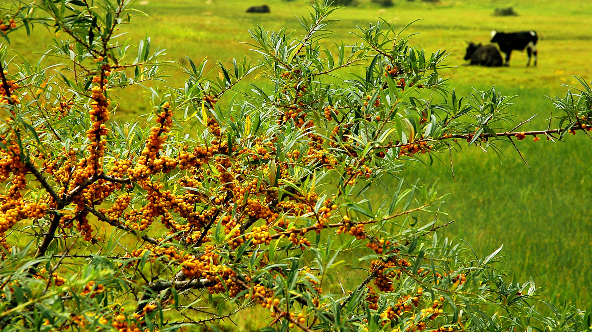 沙棘是右玉人口中的致富“金果果”(右玉县委宣传部供图) 右玉地处山西西北端,北纬39度沙棘生长黄金带,平均海拔1500米,光照充足、生长季平均日照时数达13.5小时,昼夜温差大、平均日较差达到20度左右……独特的地理位置、适宜生长的气候条件,造就了右玉沙棘果实营养成分全、含量高、品质上乘,是绝好的天然绿色食品、保健品、药品的原料,深受市场青睐。 右玉县是全国沙棘进入产业化开发的起步之地,也是全国30个沙棘产业建设重点县之一。1984年,该县制定并印发了《关于大力发展沙棘事业的决定》,同年,设立了全国第一家沙棘加工企业右玉县沙棘饮料厂,成立了全国第一个沙棘研究单位右玉县沙棘研究所,奠定了右玉沙棘产业发展基础。
