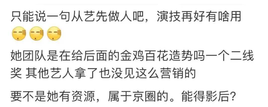前两天,第19届长春电影节公布了获奖名单。 金鹿奖最佳女演员由00后小花李庚希摘得, 但#李庚希金鹿奖影后#的热搜词条下骂声一片: “就她?拿奖?哈哈笑死了…”⬇️ “没人了吗?内娱算是完蛋了”⬇️ “说实话她拿这个奖有点虚”⬇️ 原因在于:她的对手可是周迅和海清… 一位前段时间才凭借《不完美受害人》的林阚一角二封白玉兰视后, 另一位则有《隐入尘烟》《红海行动》《小别离》等出彩的代表作。 二位在影视圈算是大前辈,演技得到的好评居多,也获得了不少奖项。 败给李庚希?凭啥? 获奖名单宣布后,李庚希立刻就被卷入了风暴中心。 一部分人周迅和海清鸣不平, 另一部分人则重点审判李庚希够不够格拿影后。 不过也有看了三个人在各自作品里的表演后认为李庚希拿奖没毛病,在评论区为她逆风输出。 原因在于,早在金鹿奖提名名单宣布时,最佳女演员的人选和作品就引起了不满。 海清主演的《我本是高山》,在点映时期就因立意和改编问题争议不断,导致上映前备受期待,但最终票房仅有1亿。 (具体的改编争议橘之前写过,指路👉《她的算盘,这次打得太响了…》) 光是入围就已经骂声一片,几乎与拿奖无缘。 饰演张桂梅的海清也被辣评形似神不似👇 意味着影后只能在《涉过愤怒的海》中饰演景岚的周迅, 和在《我们一起摇太阳》中饰演凌敏的李庚希之间诞生。 不管是论资排辈还是演技上的口碑,周迅都是更被看好的那位。 只不过周迅在《涉过愤怒的海》中的戏份只能算是镶边女主, 三部电影的口碑也是《我们一起摇太阳》更高。 #《我本是高山》还没开分,但评分以1星居多。 李庚希在影片中的表现备受认可, 三个入围者中反而是她拿奖更能让人接受。 因为在影片中真实还原了尿毒症患者的通篓经历, 自动播放 几段表演演绎出了患者人生被病症侵占的焦灼、敏感、迫切求生的挣扎, 自动播放 获得肾源捐献又被告知取消,从欣喜到绝望再到释然的情绪转变, 都让她的演技得到认可。 加上李庚希本身就有《小欢喜》里的英子、《兔子暴力》的水清、《漫长的季节》的沈墨等角色的口碑在前, 一直被视为00后小花中不容忽视的一匹黑马。 这次凭借《我们一起摇太阳》获得金鹿奖影后,大多数看过影片的观众都认为以她在影片中的表现得奖并不算爆冷。 但李庚希在得奖后还是引起了争议, 甚至只是换下写着“影后”的手机壳发微博回应感恩得奖, 也因此前在综艺里的表现被骂“学艺之前先做人”, 影后身份难以服众。 一方面是认为她的表现跟金鹿奖历届影后相比有些勉强⬇️ 另一方面则是跟李庚希本身就存在的争议有关。 她“资源咖”的标签由来已久, 进入娱乐圈的第一部作品就是由徐静蕾监制的网剧《同学两亿岁》, 签约的经纪公司鲜花盛开影业也在徐静蕾名下⬇️ #另一位股东徐子建是徐静蕾的父亲。 出道即女主不说,还有徐静蕾的力捧。 网剧宣发期间,徐静蕾亲自上阵带着李庚希一起上节目宣传⬇️ 还在节目里透露李庚希的父亲是自己小时候学画画的同学⬇️ 有了这层关系,不是科班出身、仅上过10个月表演培训班的李庚希,获得的影视资源都让她与资源咖划上等号。 接下的剧本中她主演的居多,更不用说还有《小欢喜》《二十不惑》《漫长的季节》这样的大制作。 在讲述短道速滑故事的《超越》中压番胡军、沙溢也是她资源咖的佐证之一。 在本身就有着争议的前提下, 还伴随着她在外留学回国高考落榜、 屡次被拍到抽烟且乱扔烟头的行为、 被曝恋情等八卦绯闻。 甚至在高考落榜这件事上,倪萍不仅亲自出面帮她解释,还主动表示要介绍纽约电影学院的副院长给她认识。 有着这样的标签如果演技被认可还好说,比如说凭借《小欢喜》里的英子出圈时,不俗的表现让人忽略了她的资源咖标签。 那时的李庚希还是灵气四溢的新晋小花,胜在演技灵动自然,获得的评价也比较正面。 但在《雪中悍刀行》中,因长相与原著中的大美女人设不符,演技被认为在古装戏中有些突兀。 免死金牌不管用,自然就遭到了全方位审判。 到了《漫长的季节》,关于她演技的评价依旧两极分化。 有说她角色的转变完成度还不错,坚韧和狠戾都演了出来, 想不到谁能在这个角色上取代她⬇️ 也有人认为她演技很木只会演表面不会演内心, 把原本发挥空间较大的角色局限化了⬇️ 尤其是在范伟、刘琳、张静初等前辈的对比下,显得她的演技并不突出, 只是在年轻演员里较好。 本身就有资源咖争议,演技也遭到了质疑,在综艺《十天之后回到现实》里的表现更让她所剩无几的路人缘全盘崩坏。 节目呈现出来的李庚希, 情绪极不稳定容易冲动上头, 莫名其妙怀疑队友导致队友淘汰。 之后又因为想帮朋友出气,跟另一名参赛选手产生了正面冲突⬇️ 种种行为都在摧毁她过去的荧幕形象, 以至于这次获奖,一些认可她演技的人也表示让她好好演戏别参加真人秀了。 距离金鹿奖开奖已经过去了两天,但由奖项发酵起来的话题还在继续。 除了以上的争议,李庚希此番获奖,还引起了关于“00后小花的崛起以及格局改变”的探讨。 手握华表奖、金鹿奖影后,主演票房39亿的张子枫,依然是00花中卖好又卖座的独一档。 文淇凭借《嘉年华》获得金马奖最佳女主角提名、《血观音》获得金马奖最佳女配角,也是为数不多拥有电影实绩的00后